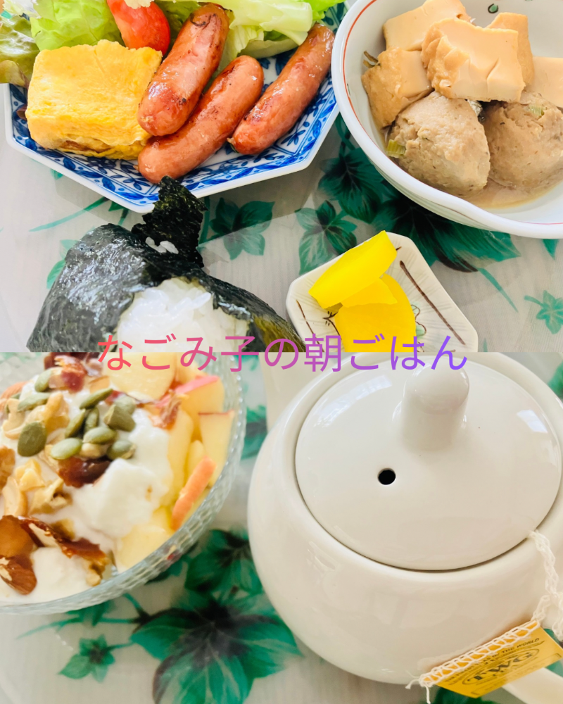 おにぎり🍙に、はまってます💖ウィンナーは、下茹でした後にソテー今日の卵焼きには、マヨネーズを混ぜて厚揚げと鰯のツミレの煮物りんごとバナナのヨーグルトにはたっぷりのナッツとひまわりの種デーツ紅茶☕️満足です♪